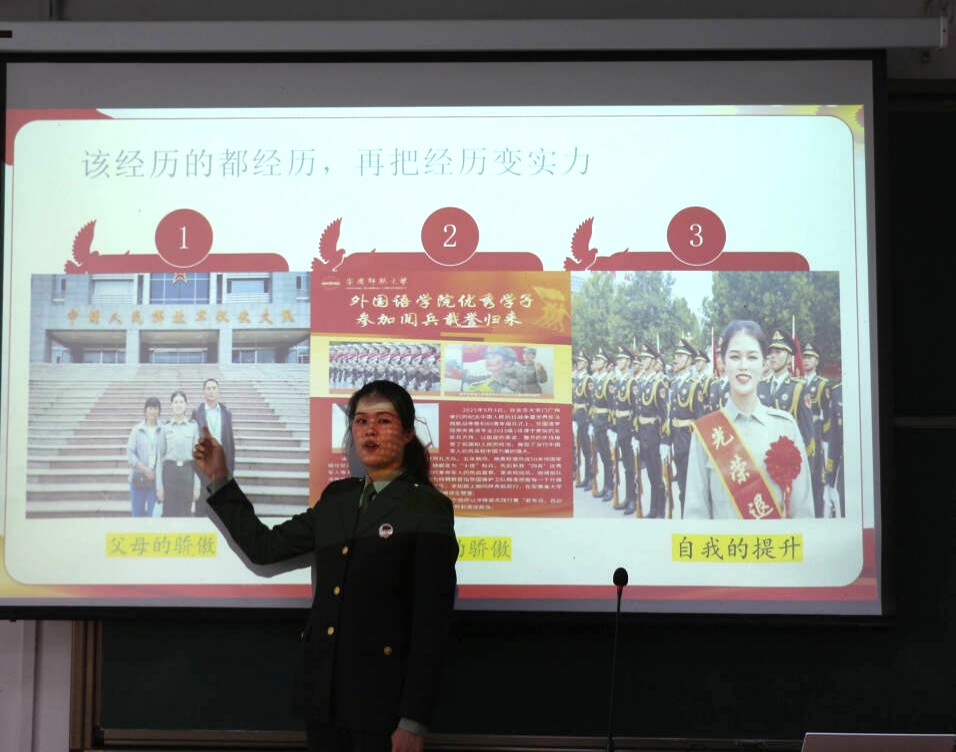 乐动(中国)退役大学生谭宁则结合自身五年的服役经历,以及参加纪念中国人民抗日战争暨世界反法西斯战争胜利80周年阅兵仪式的收获和感悟,生动诠释了“强国复兴有我,青春献给祖国”的豪情壮志。她鼓励同学们积极投身军营磨砺个人品质,体验青春与国家发展共同跳动的美好,进一步增强了国防教育的感染力和号召力。