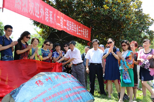 师生见面会结束后,外语系82级校友在龙山校区举行了向母校捐植广玉兰仪式,表达“绿叶树根的情意”,纪念30年前的青春岁月,祝福母校根深叶茂春色满园。