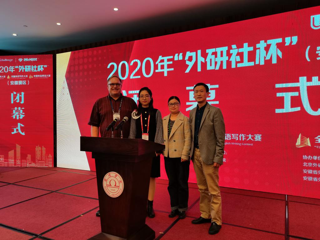 10月31日至11月1日,2020年“外研社·国才杯”全国大学生英语挑战赛系列之英语演讲比赛安徽省决赛在宿州学院隆重举行。来自省内40余所高校的88位选手进行了为期两天的激烈角逐。2017级英语专业徐一凡同学和2018级电子信息科学与技术专业的龙呈瑞昕同学代表我校参加了比赛。两名选手凭借扎实的语言基本功、广博的知识面、极强的现场反应能力喜获佳绩。徐一凡同学决赛排名第二,荣获一等奖;龙呈瑞同学获二等奖。徐一凡同学将代表安徽省参加12月份在北京举行的全国总决赛。
