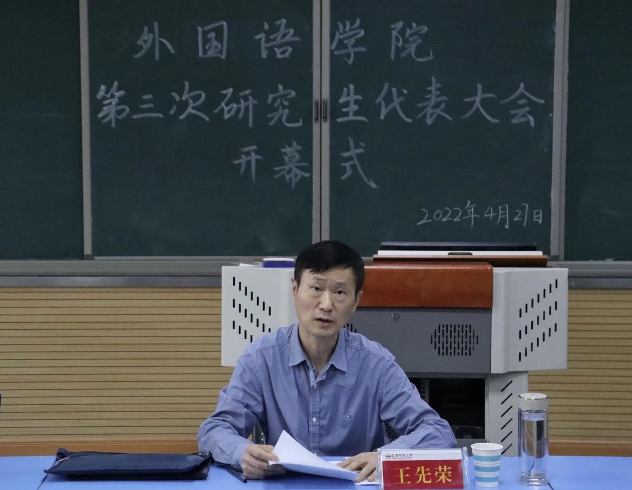 会议在庄严的国歌声中拉开序幕,王先荣对研究生代表所开展的各项工作给予高度肯定,对他们的辛勤付出表示感谢。同时,提出三点希望:第一,坚定信念,志存高远。把实现个人的价值观同国家民族的前途命运紧密结合,建设一支胸怀理想、心系同学、品学兼优、作风扎实的工作骨干队伍。第二,刻苦学习,奋发有为。要广泛学习各种新知识新技能,使自己的知识结构适应时代要求,不断增强为国家和人民服务的本领,要积极参加社会实践,关注社会,关注生活。第三,全面发展,彰显个性。要在坚持德才兼备的基础上,发展个人兴趣专长和开发个人优势潜能,实现思想成长、学业进步、身心健康有机结合。