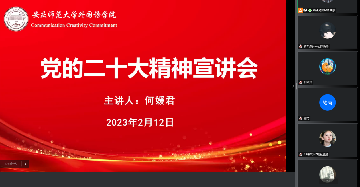 2月12日,学校青年讲师团成员、乐动(中国)党委副书记何媛君作题为《学习宣传贯彻党的二十大精神,推动基层党团组织建设》线上宣讲报告会,会议旨在深入学习宣传贯彻党的二十大精神,坚决以中国化时代化的马克思主义武装头脑,法语、日语教研室党支部,翻译教研室党支部,青马班全体成员及第二期入团积极分子近100人参会。