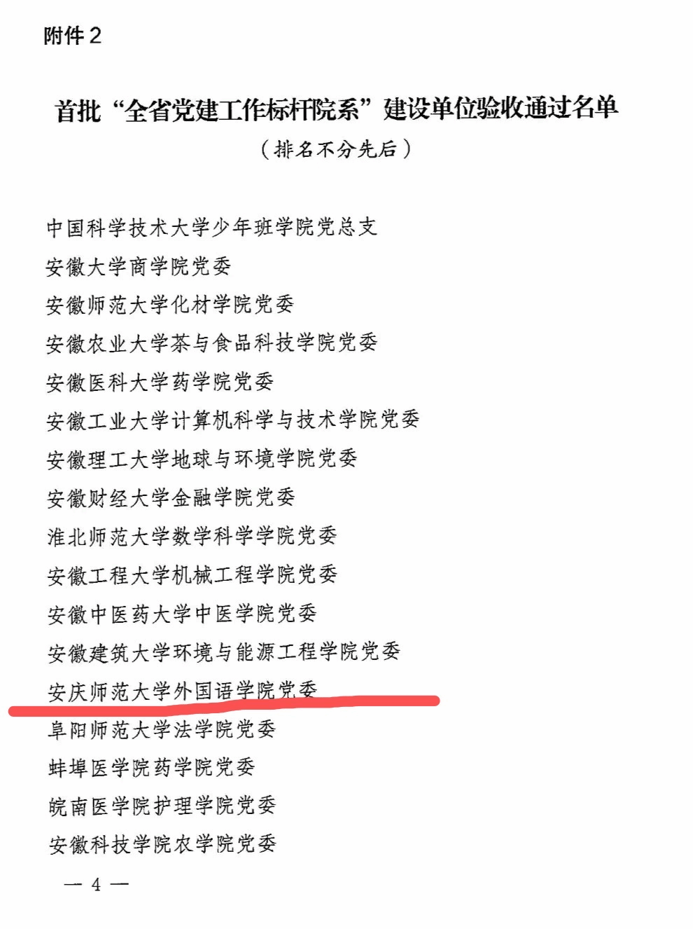 自2018年12月入选全省首批党建工作标杆院系培育创建单位以来,在校党委的正确领导下,学院党委以习近平新时代中国特色社会主义思想为指导,全面贯彻新时代党的建设总要求,深入落实党的教育方针,以政治建设为统领,以质量攻坚为动力,以提升组织力为重点,对标对表落实“五个到位”创建要求,不断拉高学院党建工作标杆,努力以高质量党建推动学院事业高质量发展,较好地完成了党建“双创”工作重点任务。学院党委被学校党委遴选进入“领航”计划校级示范库,被评为“安庆师范大学先进基层党组织”“安庆师范大学理论武装先进集体”“安庆师范大学宣传工作先进集体”。学院涌现出“中国电信天翼奖学金”“安徽省卓越教坛名师”“安徽省教坛新秀”“安徽省年度大学生人物”“安徽省向善向上好青年”“安徽省优秀共青团员”“安徽省青年好网民”“校优秀党务工作者”“校优秀共产党员”“校三全育人最美教师”等一大批先进典型。学院在安庆师范大学、在安徽省高校外语类院系率先实现国家一流专业、国家一流课程申报突破,学院“双万”建设走在学校和全国高校外语院系前列。