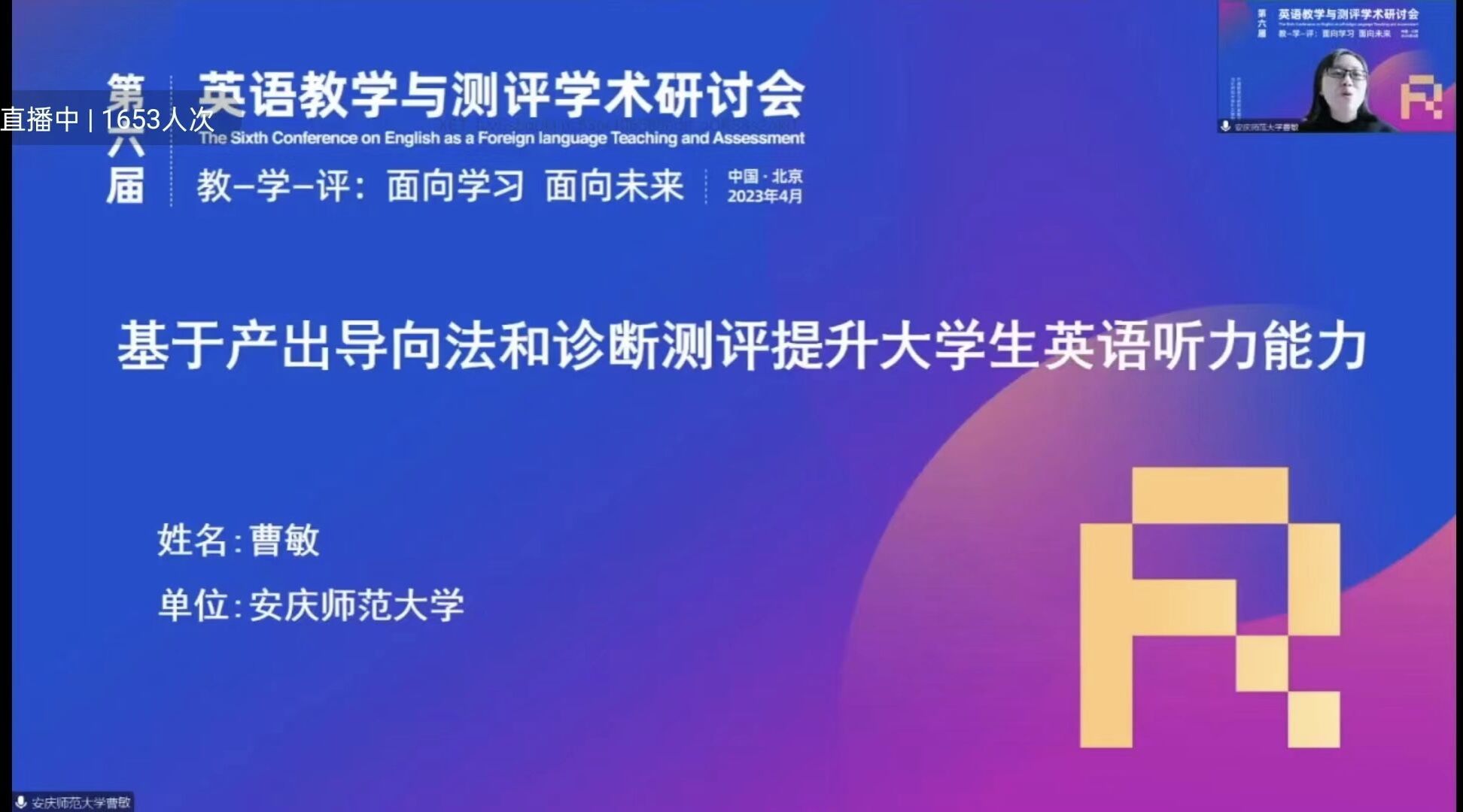 2023年4月7日至8日,由北京师范大学外国语言文学学院、外语教学与研究出版社联合主办的第六届全国英语教学与测评学术研讨会以线上线下相结合的方式成功举办,超9万人次在线参会。乐动(中国)大学英语第一教研室曹敏老师在高校分会场作了“基于产出导向法和诊断测评提升大学生英语听力能力”的“教-学-评”实践案例展示。