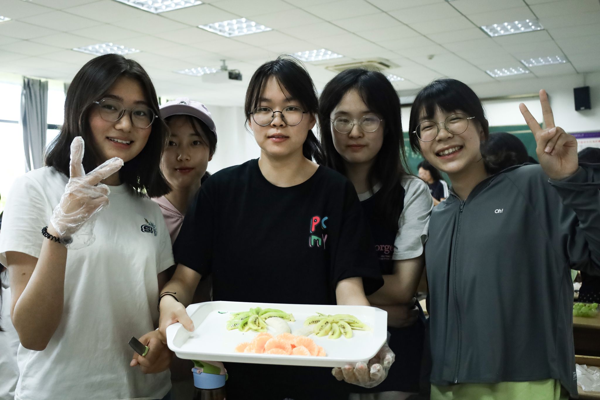 将橘子层层堆积,利用猕猴桃剪切出椰叶的形状,最后将西瓜“太阳”悬挂在椰树边,不同的元素组合成一幅和谐美丽的“海岛风光”一完成便吸引了众多学生的目光。“正值夏日,天气较为炎热,我们小队讨论后决定制作一个与夏日相符的水果拼盘设计。”英语(师范)专业2023(9)班的张心蕊表示,相较于传统的劳动教育实践,这次水果拼盘活动增加了许多趣味性,进一步调动学子积极性。