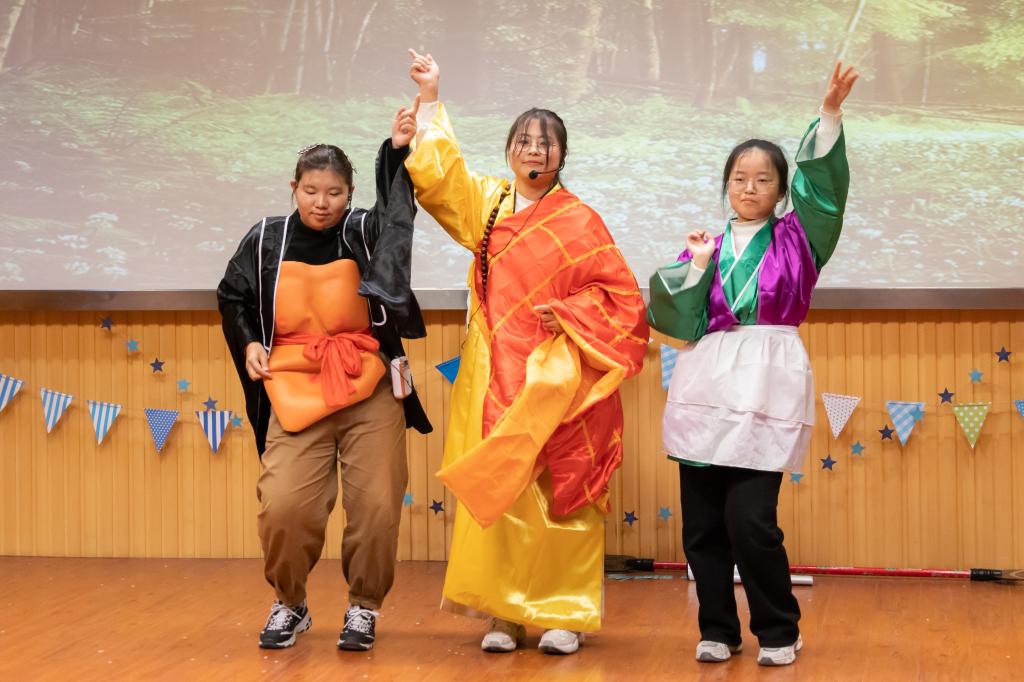 狱中绣国旗、山村助读书、医院送食物……通过不同场景的变换,外国语言文学类专业2022(12)班选取张桂梅兴办女子学校、全民抗击新冠疫情等事例,以单元组合叙事方式呈现话剧《我和我的祖国》。“Trust ourseles!”“Trust our people!”“Trust our country!”参演学生手挥红旗,在合唱中完成谢幕。“这是一个非常好的戏剧,我很喜欢。”外籍教师Anthony表示,将中国故事翻译成英文并不是一件轻松的事情,他为学生能坚持翻译而感到惊喜,也被他们的表演所感染。