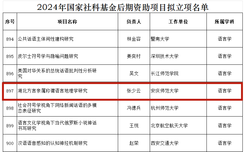 12月17日,全国哲学社会科学工作办公室公布了2024年度国家社会科学基金后期资助项目暨优秀博士学位论文出版、优秀学术著作再版项目拟立项名单,我院张少云博士获批国家社会科学基金后期资助项目。