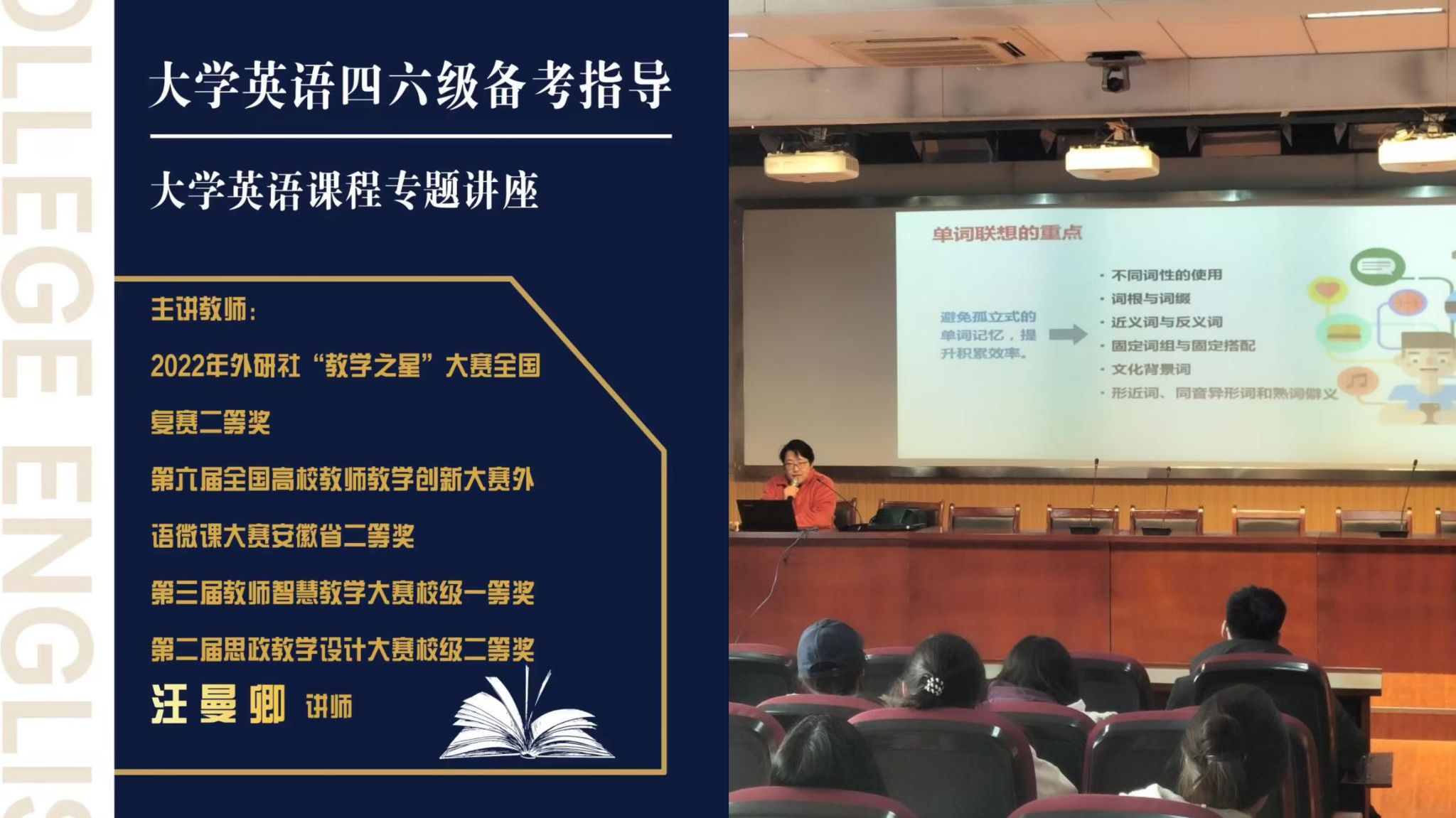 汪曼卿对大学英语四六级考试总体考核要求做了简要介绍,在总结各个题型特征、出题原则及试题分布规律的基础之上,详细介绍了解题技巧及应试策略,重点分析了备考中英语词汇学习的重要性,并从词性差异,词根与词缀,近义词与反义词,固定词组与固定搭配,文化背景词,形近词、同音异形词和熟词僻义等方面分享了单词联想学习的技巧,推荐了适合备考的在线英语学习小程序和图式法、歌词、字幕学习等单词记忆方法。