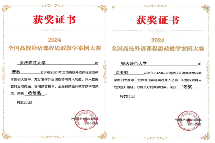 近日,2024年全国高校外语课程思政教学案例大赛公布获奖名单,我院喜获两个奖项,曹敏老师基于《大学英语视听说》的课程思政教学案例荣获特等奖,徐亚茹老师基于《大学英语读写教程》的课程思政教学设计作品荣获三等奖。