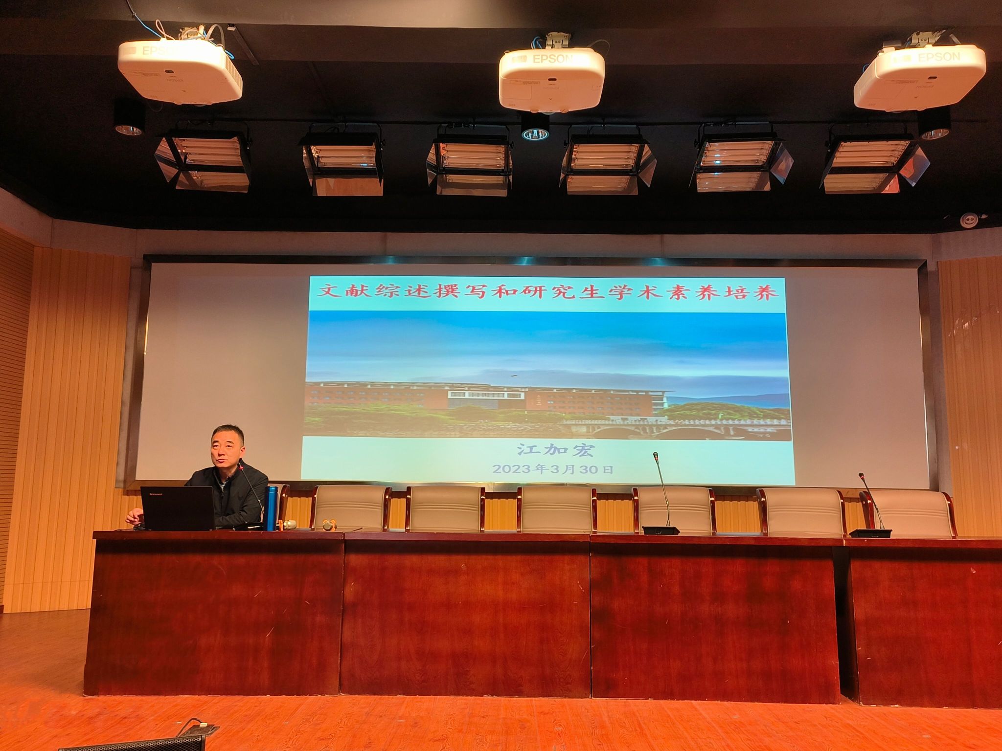2023年3月30日,乐动(中国)“望道”讲坛第三讲在外语楼E503报告厅成功举行。讲坛邀请江加宏教授作“文献综述撰写和研究生学术素养培养”主旨报告。报告由乐动(中国)副院长黄全灿主持,21、22级研究生和本科生以及部分教师共计100余人聆听了报告。