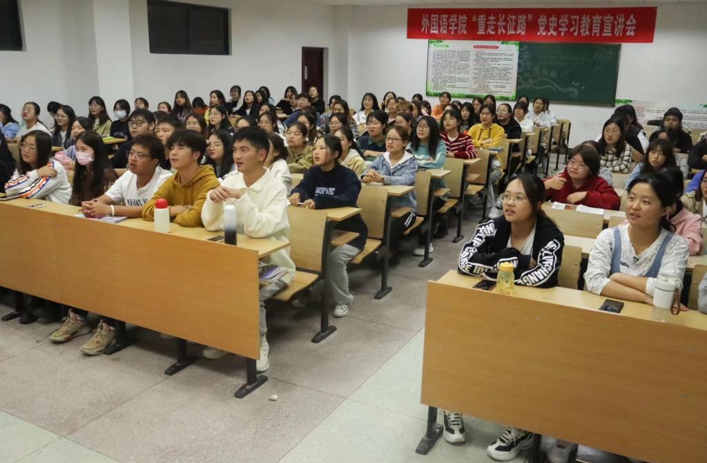 “有谁可以和我们分享一下有关遵义的小故事吗?”“我可以!”宣讲过程中还穿插了观看党史动漫、有奖党史竞答等环节,外国语言文学类专业2021(4)班的郭荣站起来讲述了一段“红军坟”的故事。“这是我第一次通过这种宣讲的方式来学习党史,学长学姐们用自己亲身经历的红色旅程来向我们介绍长征,给了我很大触动!”郭荣表示,作为一名大一新生,她会在大学四年中坚定理想信念,用实际行动来证明对前辈们的致敬。