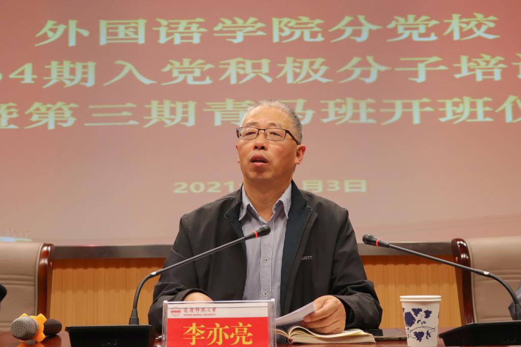 会议在庄严的国歌中拉开序幕。李亦亮对全体学员表示欢迎与祝贺,并向他们提出五点希望。他希望学员们一要提高对理论学习的认识,深刻理解学习的意义和重要性;二要认真学习理论知识,把握党的理论的系统性,做到学习入脑、入心;三要严格遵守培训班安排和纪律要求,做到真学、真信,完成学习任务;四要积极做好学生工作,提升工作能力,为学生服务;五要争做表率,促进德智体美劳全面发展,用实际行动向党组织靠拢,争做优秀的青年马克思主义者。