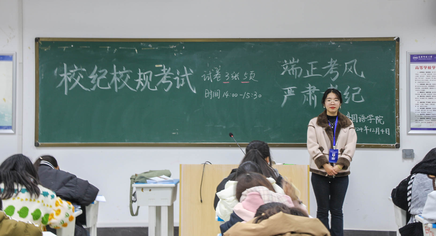 考试现场秩序井然,监考员严格履行监考职责,一丝不苟地执行考场纪律。同学们认真思考,仔细答题,展现出了良好的精神风貌。2024级外国语言文学类9班朱浩表示:“此次考试能帮助新生们更好地了解和适应大学生活,通过这次考试,我对学校、学院相关规定有了更多地了解,以后也会严于律己,勤学笃行。”