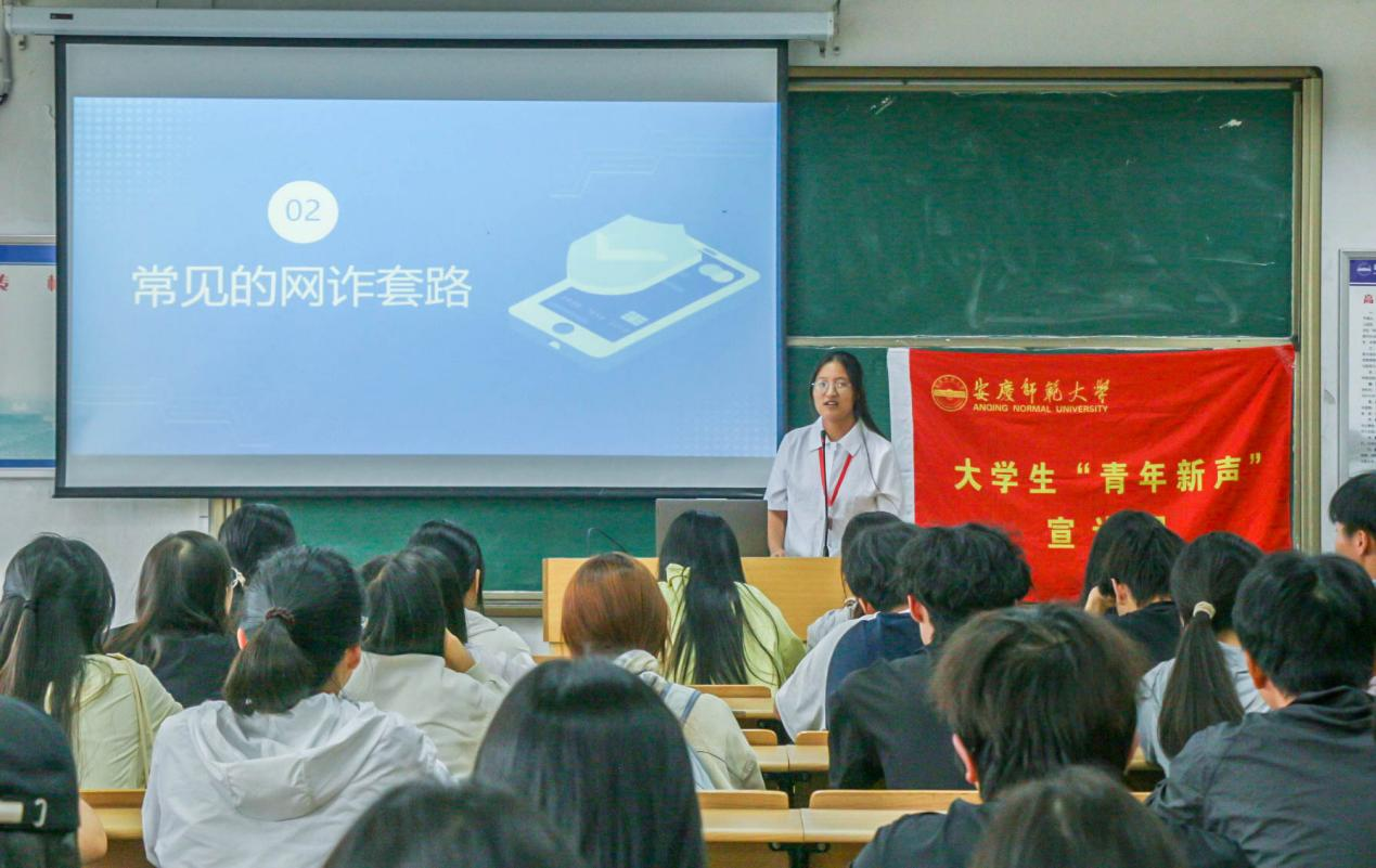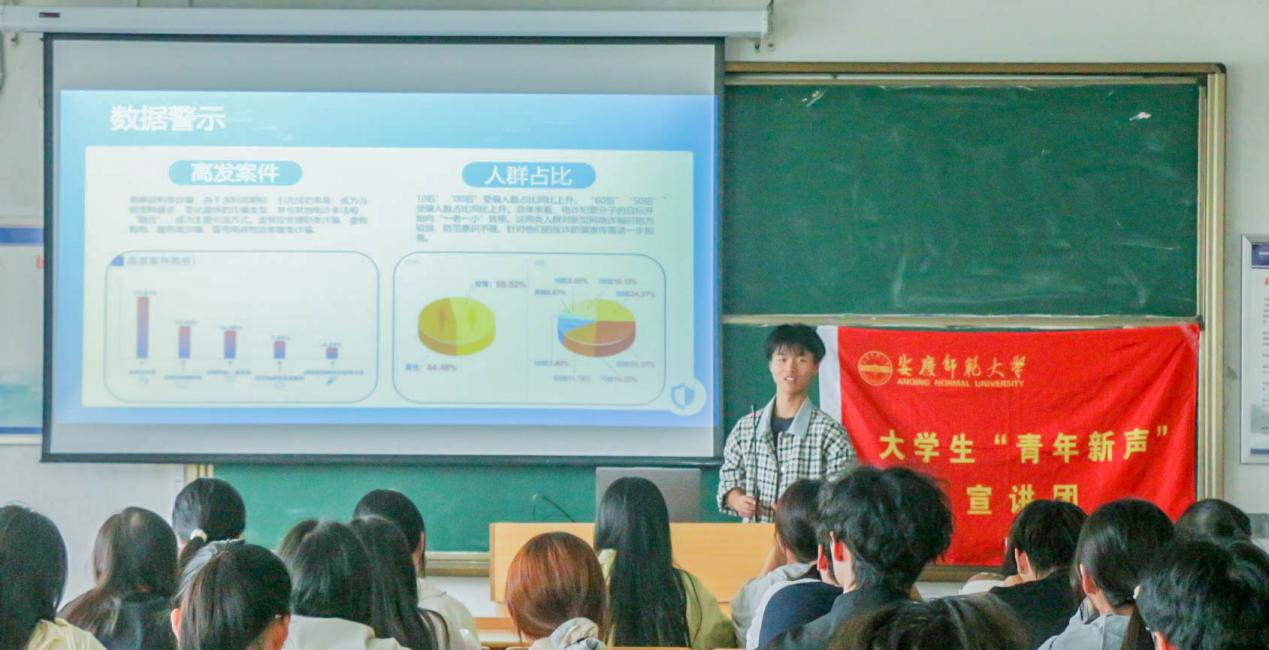 宣讲会上,宣讲团成员潘宇翔结合当前全国防电信诈骗形势,通过详实的数据和典型案例,揭示了电信网络诈骗的高发性和危害性。他指出,目前电信诈骗类型多样,手段网络化、技术化,并且会针对在校大学生的心理弱点进行诈骗,易造成影响家庭稳定、干扰校园秩序、降低社会信任等不良影响。